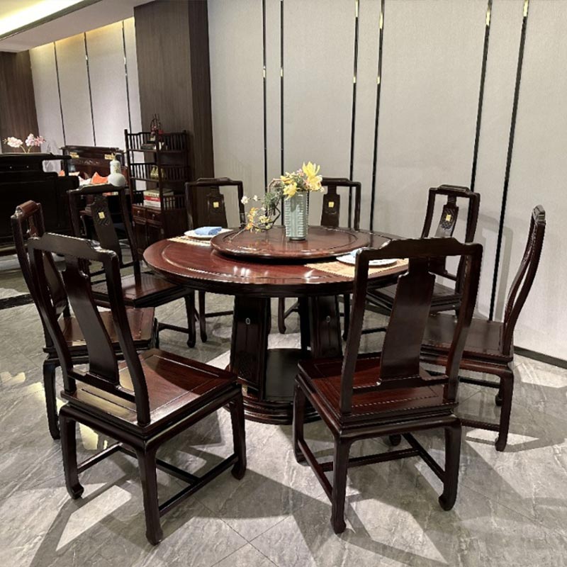 Можете да бъдете спокойни, че купувате азиатски комплекти кръгли маси за хранене от нашата фабрика. Подбрано абанос, твърдо дърво, фина текстура, излъчва дълбок и мистериозен блясък. Всяко парче дърво е внимателно подбрано, за да представи перфектно качество. Той е внимателно произведен от фабриката за секвои Chuantianjiang. Абаносът му придава уникална текстура и усещане за стабилност и величие идва на лицето. Структурата на вдлъбнатина и шип наследява хилядолетното майсторство и е изключително здрава без пирон или лепило. Това е не само умение, но и културно наследство, показващо мъдростта и изобретателността на древните. Използването на структура на вдлъбнатина и шип е традиционно и изящно, което прави структурата на кръглата маса стабилна и може да се използва дълго време.