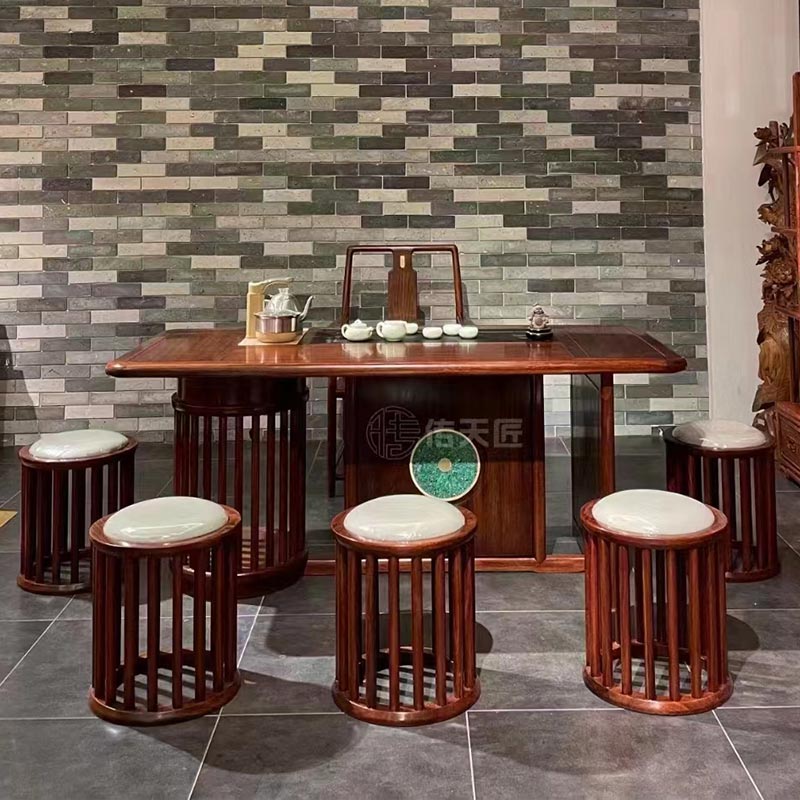 Класическата маса за чай от палисандрово дърво в китайски стил е местообитание за душата и място за събиране на приятелства. Тук си сварете чаша ароматен чай и опитайте спокойствието и красотата на живота. В преливащия аромат на чай усетете потока на времето и се насладете на момент на отдих. Той е внимателно изработен от абанос и идва от фабриката за секвои Chuantianjiang. Направете живота по-вкусен и времето по-поетично. Чайната маса е гъвкава, за да се съчетае, а фотьойлите и табуретките могат да се комбинират според нуждите.