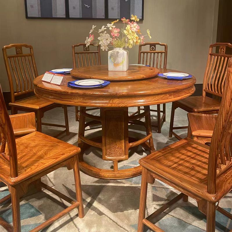 Кръгла трапезна маса в класически китайски стил е изработена от палисандрово дърво на таралеж, с отлична текстура и текстура като естествен свитък. Всеки ред разказва историята на годините. Изящното майсторство издълбава дървото в перфектен кръг, символизиращ обединение и щастие. Той е внимателно произведен от фабриката за секвои Tianjiang с отлично качество.