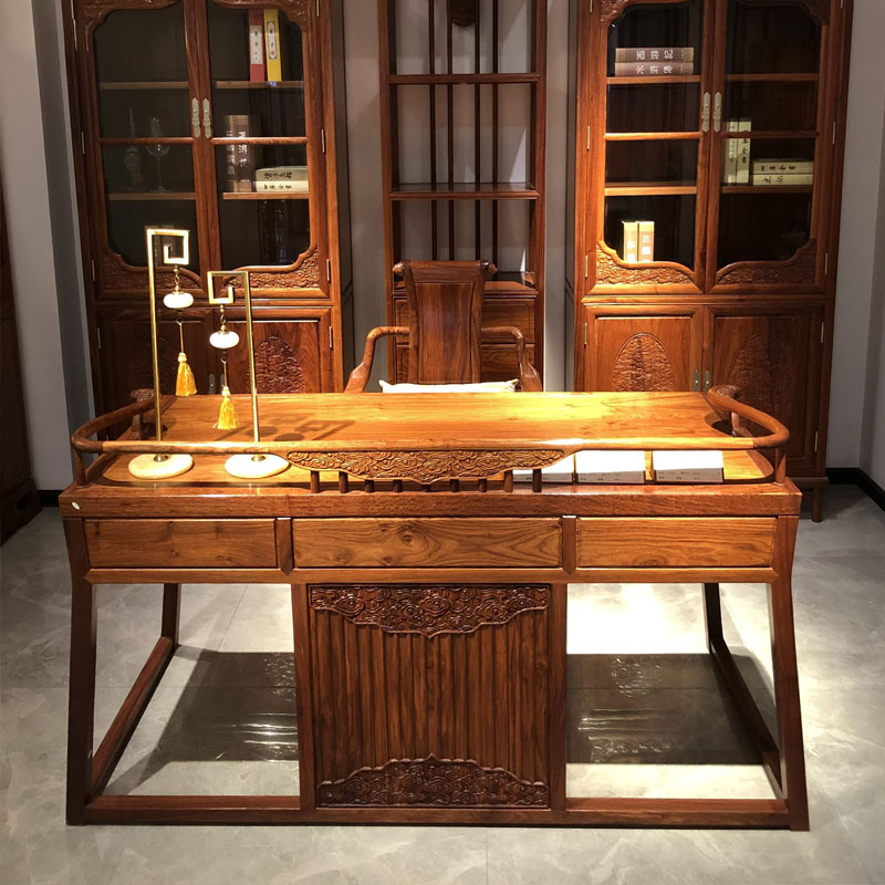 Бюро от масивна дървесина в класически стил приема структура на вдлъбнатина и шип, без нито един пирон, но може да направи всяка част тясно свързана и изключително здрава. Този занаят не само показва превъзходното майсторство на занаятчиите, но също така отразява уважението към естествените материали и наследството на традиционното майсторство. Когато използвате това бюро в класически стил от масивно дърво, можете да почувствате неговата твърдост и спокойствие, сякаш ви казва, че то ще ви придружава през всеки ден на упорита работа и ще ви осигури солидна опорна платформа. В дизайна на бюрото са включени изящни издълбани благоприятни шарки на облаци, които му придават уникален артистичен чар и културна конотация. Облаците с късмет символизират късмет, красота и щастие в традиционната китайска култура. Те са въплъщение на копнежа и стремежа на хората към по-добър живот. Тези реалистични късметлийски шарки на облаци са деликатно издълбани с плавни линии, сякаш танцуват върху бюрото, създавайки спокойна и спокойна атмосфера за вашия кабинет.